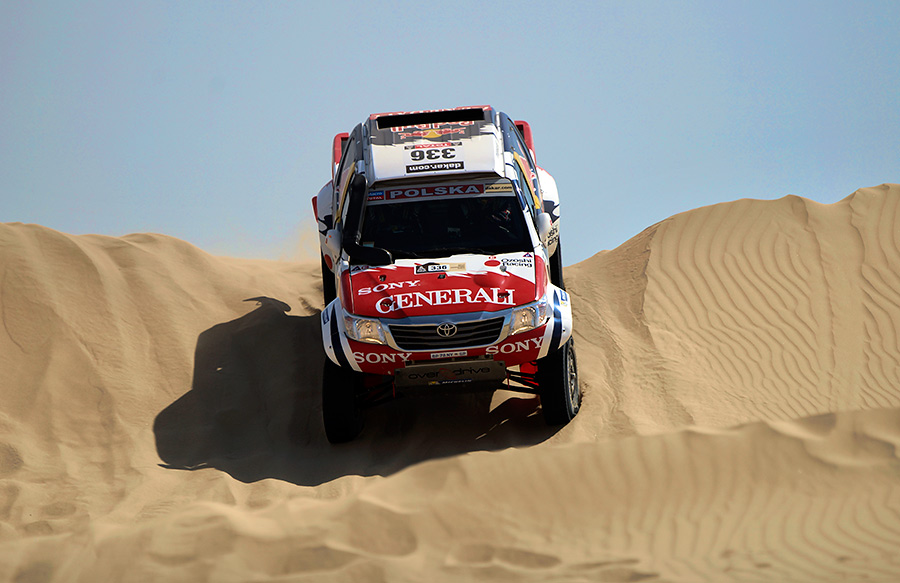 – Zostaliśmy na pierwszej wydmie – mówi Adam Małysz. – Jechaliśmy za Terranovą, który był dzisiaj czwarty. Argentyńczyk hamował w leju, musiałem zwolnić i zakopaliśmy samochód. Trzeba był cofać, spuszczać powietrze z opon. Straciliśmy tam około 30 minut. Potem jechaliśmy już na niskim ciśnieniu. Podczas niebezpiecznego przejazdu przez rzekę uderzyliśmy kołem w kamień, no i trzeba było zmieniać koło. Wtedy wyprzedzili nas de Rooy i Gordon – opowiada Małysz.