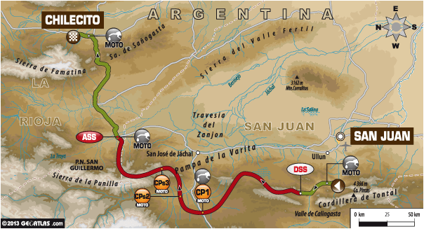 Po dwóch dniach ścigania wszyscy zawodnicy ponownie spotkają się na jednym biwaku. Chilecito to mała miejscowość, którą zamieszkuje nieco ponad 36 000 ludzi. Okolica jest dość sucha, ale system irygacji stworzył wokół miasta klimat oazy i pozwolił na uprawę winorośli. W przeszłości był to ośrodek górniczy, po którym została jedyna tutaj atrakcja turystyczna – kolejka linowa, prowadząca do położonych na zboczach góry kopalni.