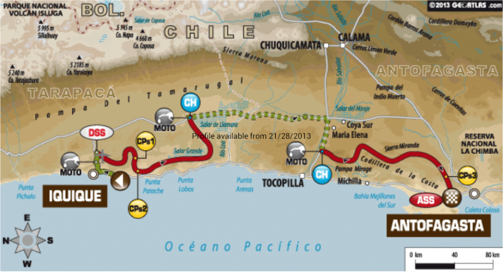 W pierwszej części odcinka specjalnego, który nie jednego doprowadzi do granic wytrzymałości, zawodnicy mogą spodziewać się piachu, piachu i jeszcze raz piachu. Droga kierować będzie na południe wzdłuż wybrzeża Pacyfiku. Dalej czeka ich sekcja neutralizacji, gdzie nie będzie mierzony czas, jednak zawodnicy nadal będą poruszać się bezdrożami. Druga część odcinka rozpocznie wymagające sekcja fesz feszu. Pokryci kurzem kierowcy i samochody wjadą następnie na dawne górnicze drogi, prowadzące do położonych niedaleko kopalni. Ta część trasy pozwoli ponownie rozwinąć większe prędkości, dając zmęczonym dakarowcom trochę frajdu z jazdy.